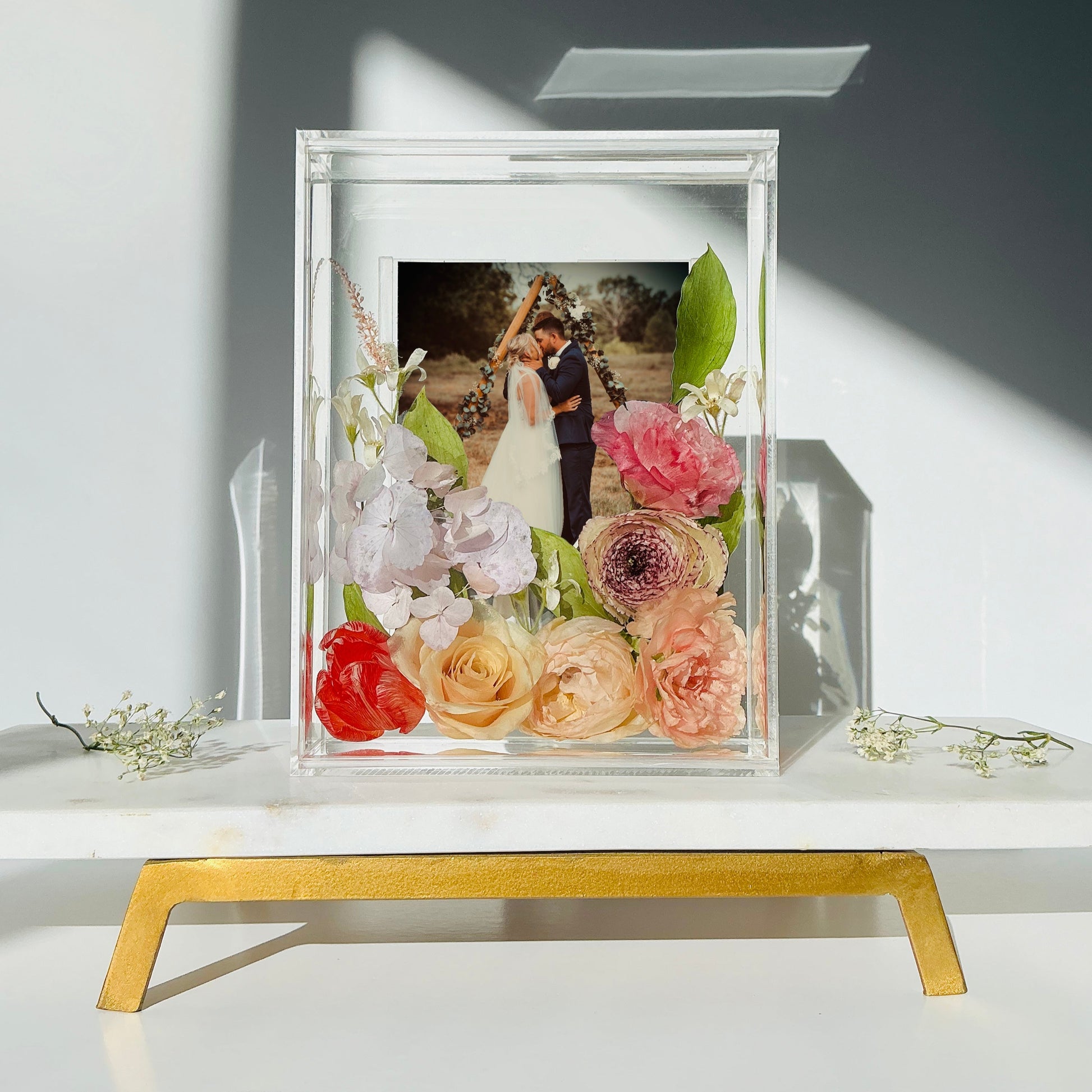 This Photo Box Frame transforms your memories into a timeless keepsake, making it the perfect way to cherish your special moments. Designed to beautifully display medium-sized preserved flowers from your bouquet, it combines elegance and practicality. The photo inserts easily from the back of the frame, while the front sliding cover provides effortless access and protection.